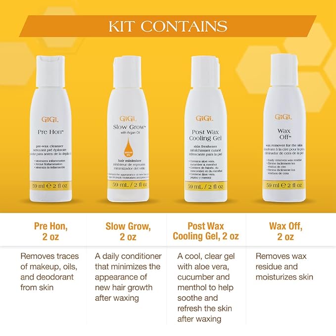 - Ultimate Trial-Pack: Contains Pre Hon for removing dirt and grime before waxing; with Wax-Off for getting rid of excess hair removal wax after treatment; clear Cooling Gel for instant relief of newly epilated skin; and Slow Grow for delaying hair regrowth
