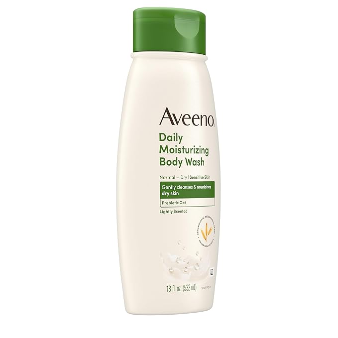 - 18-fluid ounce bottle of Aveeno Daily Moisturizing Body Wash for women and men, infused with prebiotic oat and a gentle fragrance to nourish dry, sensitive skin