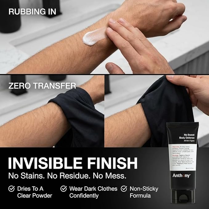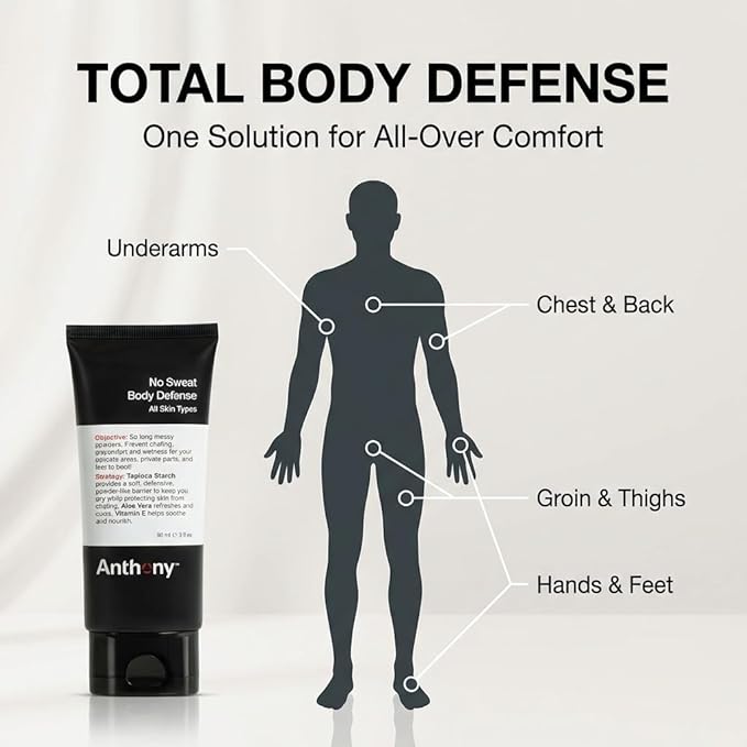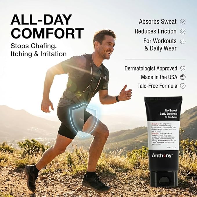 Anthony No Sweat Body Defense Deodorant for Men, Anti-Chafing & Anti-Itch Cream-to-Powder Lotion for Groin, Thighs & Underarms, Talc-Free, Absorbs Moisture, Sweat & Odor Control, 3 fl oz