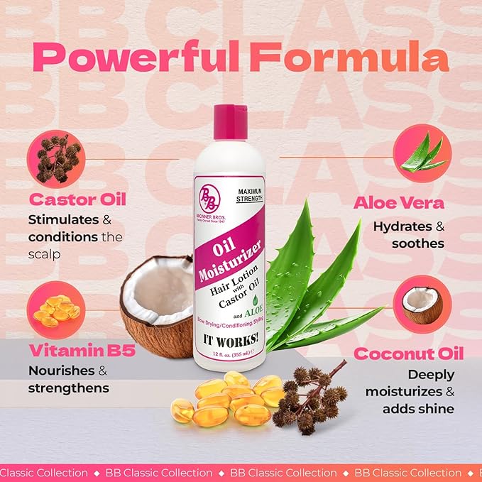 Bronner Bros BB Oil Moisturizer Hair Lotion for Damaged Hair, Scalp Stimulator with Castor Oil, Aloe Vera, Vitamin B5 & Coconut – Alcohol-Free Formula, Natural & Relaxed – 12oz