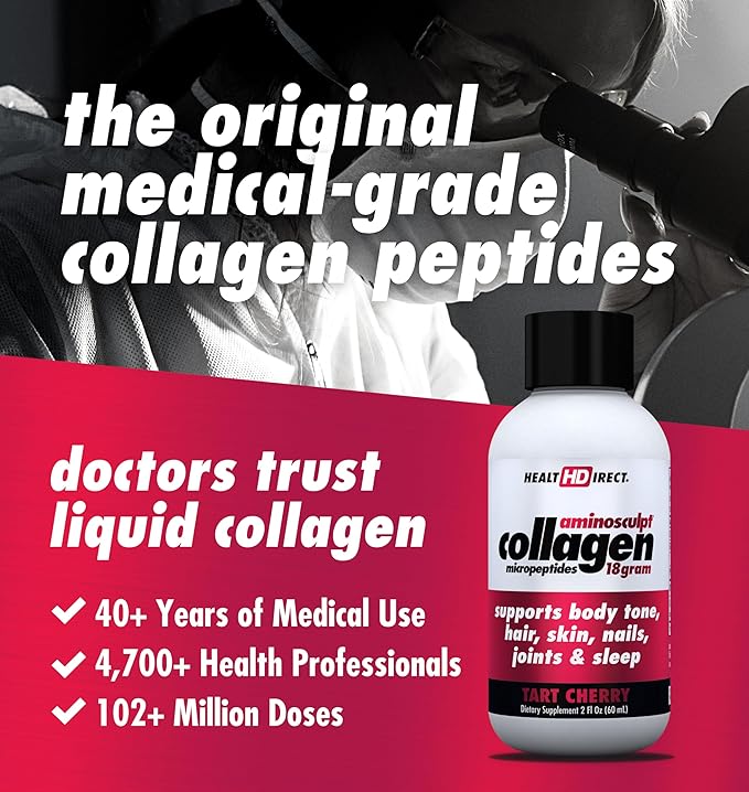 HEALTH DIRECT – Medical-Grade Liquid Collagen Shots – AminoSculpt Sugar-Free – Tart Cherry – 12 Servings, (12pk, 2oz Shots) – Good for Joints, Bones, & Sleep – Better Hair, Skin & Nails