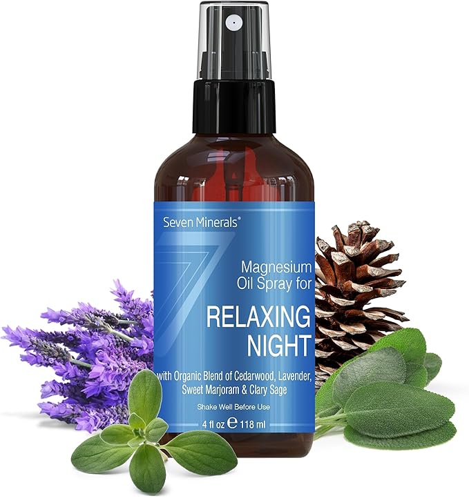 Seven Minerals Relaxing Night Magnesium Spray, Powerful Organic Blend of Essential Oils (Cedarwood, Lavendar, Sweet Marjoram, & Clary Sage) 4 fl oz