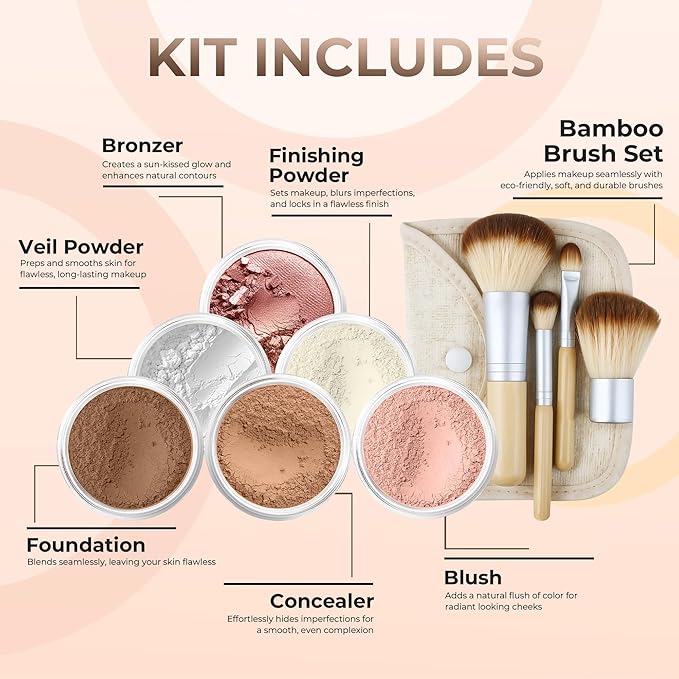- 【 KIT INCLUDES 】: 20Gms Full Coverage Foundation Powder + 20Gms Concealer Powder, 20Gms Mineral Blush Powder + 20Gms Bronzer Powder + 20Gms Veil Primer Powder + 20Gms Matte Finishing Powder + 4 Makeup Brushes with Pouch