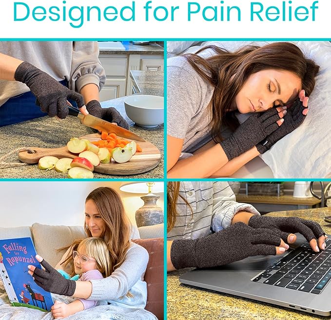 - SOOTHING COMPRESSION THERAPY: Embracing the natural shape of each hand, the Vive arthritis gloves are form-fitting, providing therapeutic compression to relieve pain, stiffness and inflammation. The soft compression gloves soothe sore, aching tendons, muscles and joints to effectively relieve arthritis pain by reducing stress on pressure points in the fingers, hands and wrists.