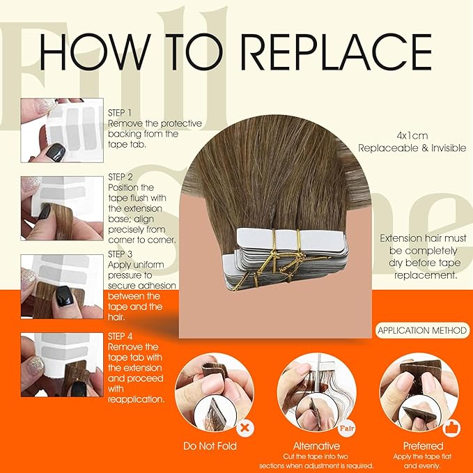 - Easy to Apply: Tape in hair extensions are designed for a streamlined application; When using the sandwich method, align both pieces, avoid excessive heat on the tape; Do not overload hair between sections; Pre-taped strips allow faster application