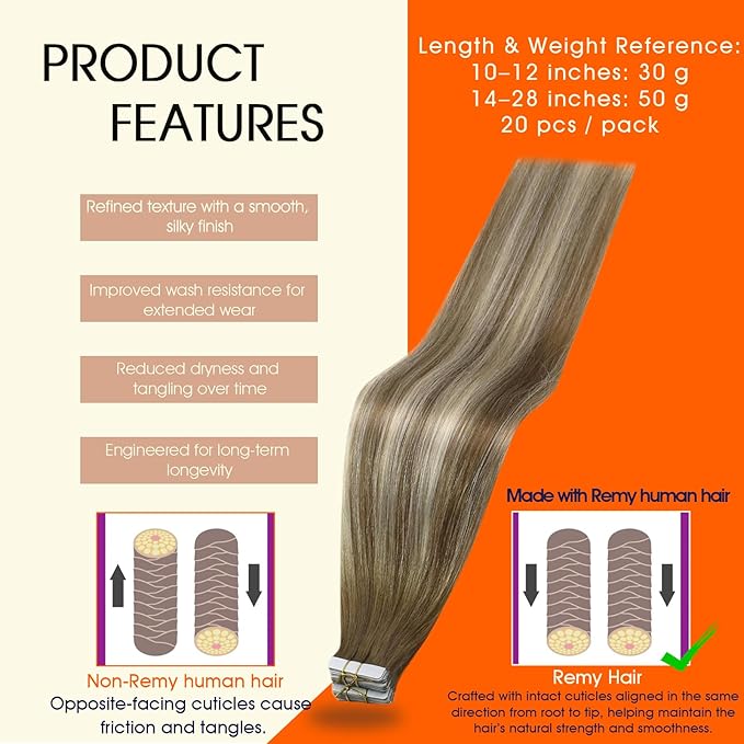- Long-Lasting Remy Hair: Tape in human hair extensions are made from remy human hair with cuticles aligned in one direction to reduce tangling and matting; The hair features a soft, silky texture, a natural look, and supports re-taping and reapplications