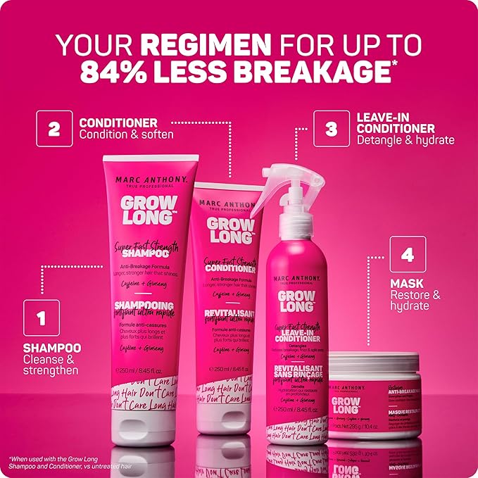- Long Hair, Don’t Care: Formulated to help you achieve those perfect lengths without limits, Marc Anthony’s Grow Long collection features moisturizing, anti-breakage formulas blended with Caffeine and Ginseng. For stronger, longer, healthier looking hair, go strong and Grow Long.