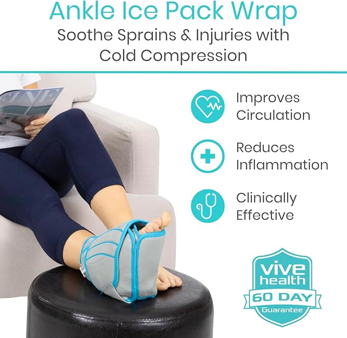 - SOOTHING RELIEF FOR FOOT AND ANKLE PAIN: Uniquely shaped for maximum coverage, the Vive compression ankle ice wrap provides targeted hot or cold therapy with customizable compression to relieve swelling and pain in the foot or ankle. Ideal for managing pain due to sprains, strains and sports injury, the flexible ankle wrap also helps relieve arthritis pain and stiffness as well as muscle fatigue.