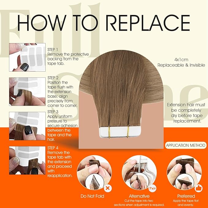 - Easy to Apply: Tape in hair extensions are designed for a streamlined application; When using the sandwich method, align both pieces, avoid excessive heat on the tape; Do not overload hair between sections; Pre-taped strips allow faster application