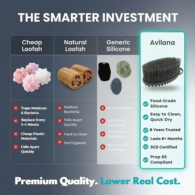 - ★ SHOWER SMARTER — WHY PAY MORE? BECAUSE IT COSTS LESS — While $5 scrubbers use mystery materials that develop odors and fall apart within weeks, Avilana delivers SGS-certified, food-grade silicone that stays fresh and performs for 4-6+ months. One Avilana replaces 4-6 cheap scrubbers per year — making your real cost per use far lower. 8 years of trusted quality since 2017.
