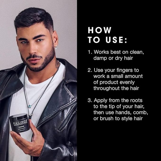 - EASY TO APPLY - Simply apply a small amount of Pacinos Creme into hands, rub it together to spread evenly, and work in from the hair roots to the hair tips to achieve your desired hair style.