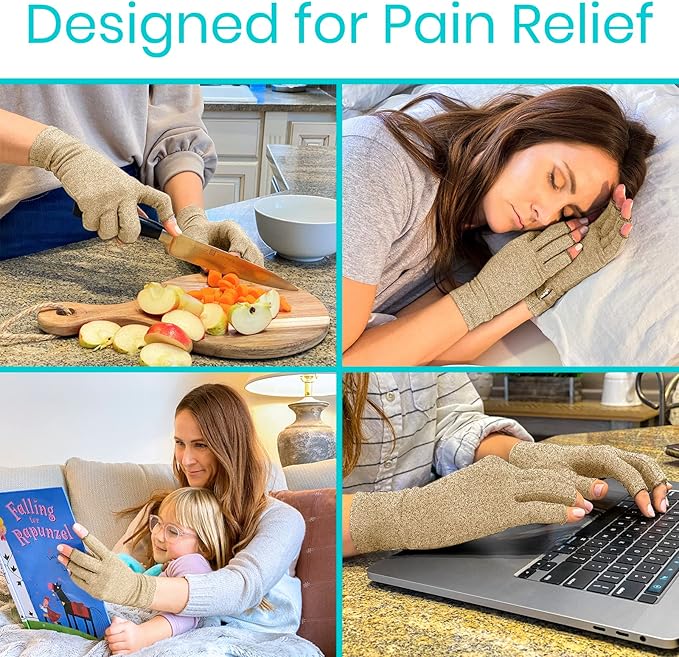 - PAIN-RELIEVING COMPRESSION THERAPY: Form-fitting for maximum relief, the Vive open finger arthritis gloves provide soothing compression therapy to alleviate pain, swelling and stiffness in the fingers and hands. Ideal for arthritis, osteoarthritis, soft tissue injuries and more, the gloves are soft and lightweight for comfortable all-day wear.