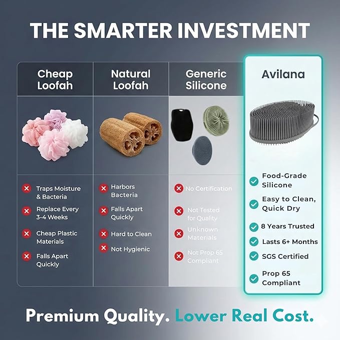 - ★ THE TRUE COST OF CHEAP SCRUBBERS — Traditional loofahs ($3-5) last 3-4 weeks. Generic silicone ($8-10) lasts 2-3 months. Avilana's durable construction performs for 4-6+ months of daily use — that's $2.50-3.75 per month for superior materials, better exfoliation, and real results.