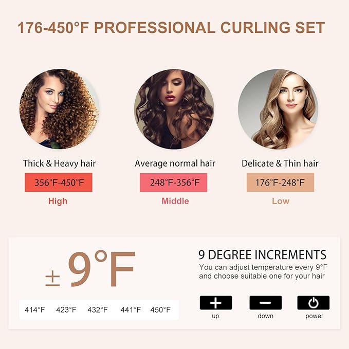 - ADJUSTABLE TEMPERATURE : This curling hair wand kit temperature is directly shown on the LCD screen, easy to check the temperature you need. By pressing the +/- keys to adjust the temperature from 180°F to 450°F which is suitable for all types of hair and will give your hair the most care