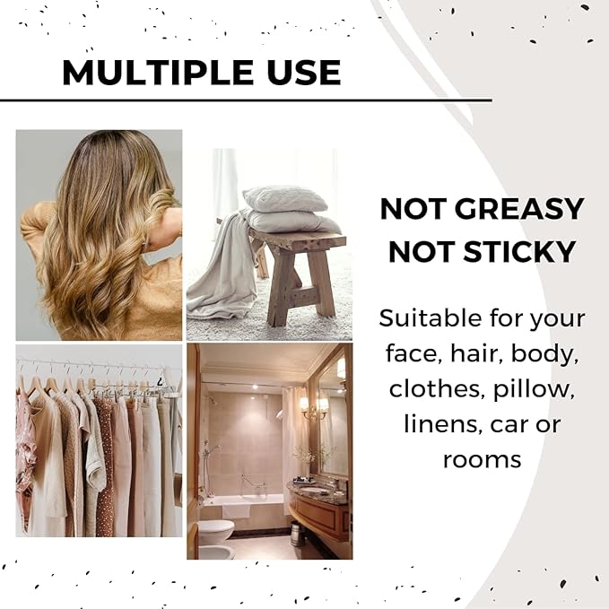 - Multiple USES: This essential oil spray is non-greasy & non-sticky. Suitable for your face, hair, body, clothes, pillow, linens, car or rooms