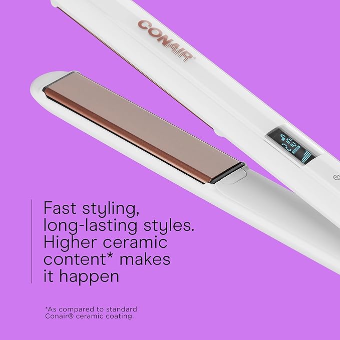 Conair Double Ceramic Flat Iron, 1-Inch Flat Iron, 5 Digital Temp Settings Up to 410°F, Extra-Long Plates, For All Hair Types and Textures, White