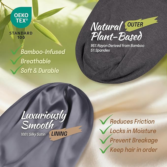 - Premium Double-Layer Fabric: Featuring a silky satin interior and a soft, breathable 95% rayon bamboo exterior, our bonnet is durable, anti-static, and resistant to shrinking after washes