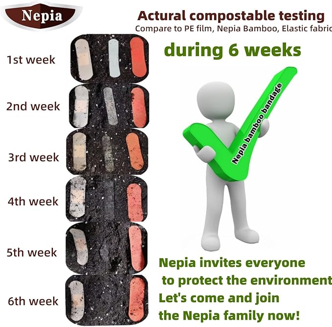 - Fully Compostable & Plastic-Free: Break down naturally in soil within 6 weeks – 3x faster than traditional plastic bandages. Safe for home composting bins or backyard disposal, leaving zero microplastic residue. Heal your skin, not harm the earth