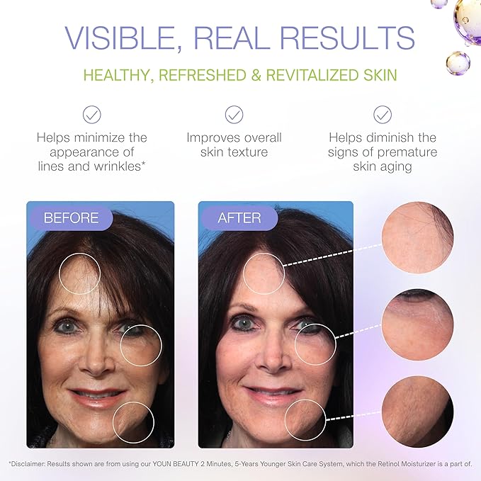 - GENTLE AND WELL TOLERATED – Our YOUN Beauty Retinol Moisturizer is formulated with stabilized, liposomal retinol complexes at 2.5% inclusion rates. These delivery systems provide approximately 0.06% active retinol. This formulation is highly effective and well-tolerated — ideal for consistent, long-term use. Unlike higher-strength retinols that are typically used only a few times per week, our formula is designed for gentle, ongoing use and visible results over time