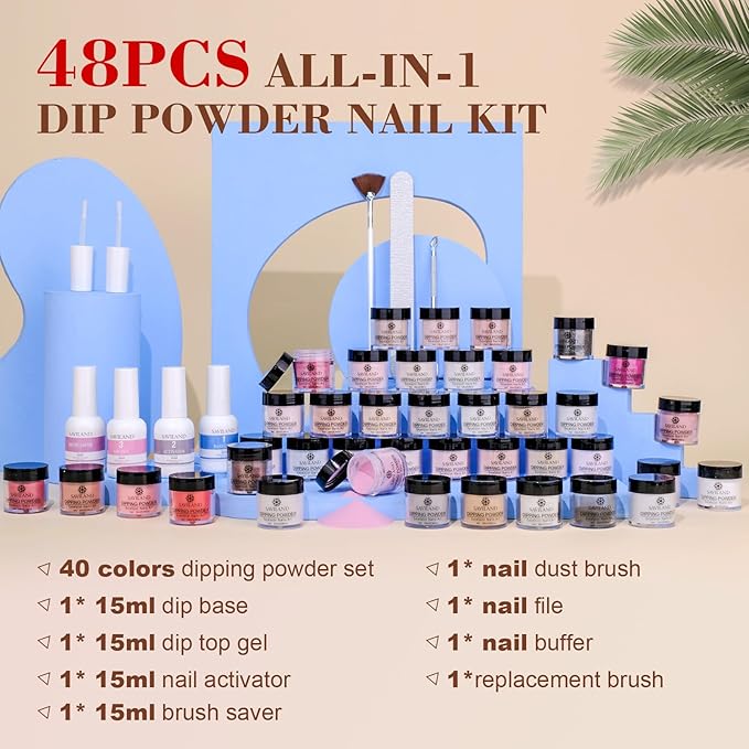 - ALL-IN-1 DIP POWDER NAIL KIT-SAVILAND dip powder nail kit contains 40 pcs dip powder, 1 pc 15 ml dip base, 1 pc 15 ml dip top coat, 1 pc 15 ml activator, 1 pc 15 ml brush saver, and essentail nail tools. 40 vibrant colors and complete nail tools in the whole kit, you can create any style dipping powder nail art design, providing a great DIY nail experience at home