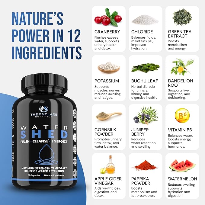 - EFFECTIVELY FLUSH, CLEANSE & ENERGIZE YOUR BODY - Enclare Watershed the gentle way to reduce water retention and weight. Made with natural ingredients that restore water balance in your body. Water weight pills for full body detox, kidney cleanse and liver support, belly bloat relief, cellulite, swollen ankle, under eye, hand, feet and leg swelling relief. Natural water weight loss supplement for women and men. Taken consistently, water shed water away capsules supports fluid balance.