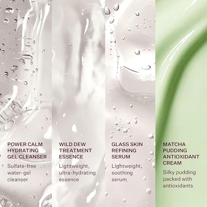 - Korean Skincare Gift Set - Power Calm Hydrating Gel Cleanser (1.0 oz), Wild Dew Treatment Essence (1.0 oz), Glass Skin Refining Serum (0.5 oz), and Matcha Pudding Antioxidant Cream (0.67 oz). Everything you need to achieve Glass Skin.