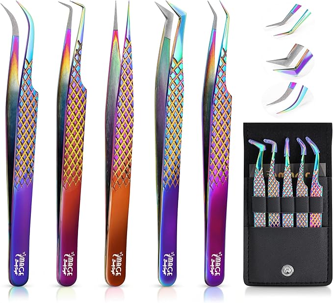 5 Pcs Fiber-Tip Japanese Steel Lash Tweezer Set with Leather Case, Professional Eyelash Tweezers for Lash Extensions – Titanium Coated, 90 & 45 Angled, Precision Pointed Tweezers (Rainbow Color)