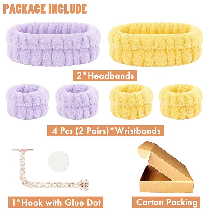 - 【Spa Headband and Wristband Set】You will receive 2 pieces of headbands for washing face, 4 pieces (2 pairs) of wrist bands and 1 piece "L" shaped hook in a box. Nice combination to change and wash. After use, hang the headband and wristbands on the hook for quick drying and convenient storage.