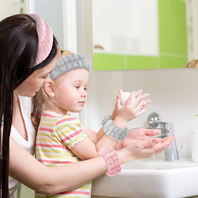 Face Washing Headband and Wristband Set of 2, Microfiber, Pink and Grey, Absorbent Spa Wristbands for Adult Women, 6 Count