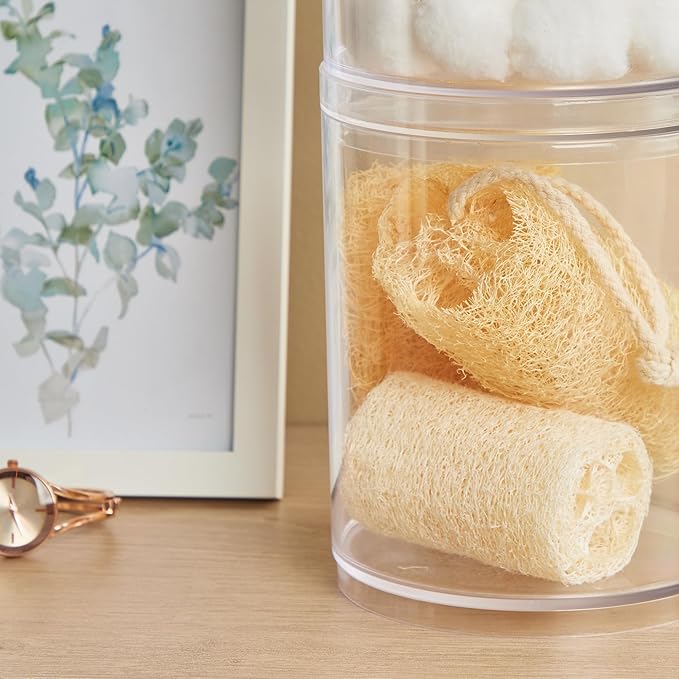 - Designed to accommodate a variety of items, from makeup and cosmetics to cotton balls and hair accessories, these circular storage bins offer a versatile storage solution that fits seamlessly into any space. Keep your essentials neatly organized and within reach, whether you're getting ready in the morning or winding down in the evening. With these stackable clear canisters, staying organized has never been easier or more stylish.