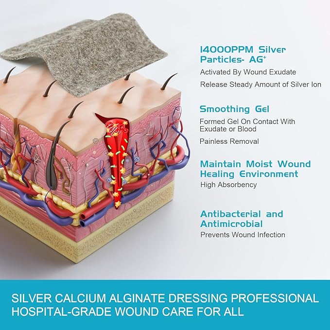 - ✅HIGH ABSORBENCY : The Ag Silver Calcium Alginate Dressing is designed to treat moderate to heavily exudating wounds by forming a soft cohesive gel on contact with wound fluid to maintain a moist wound environment and maximizes patient comfort by conforming intimately to body contours without sticking to wound.