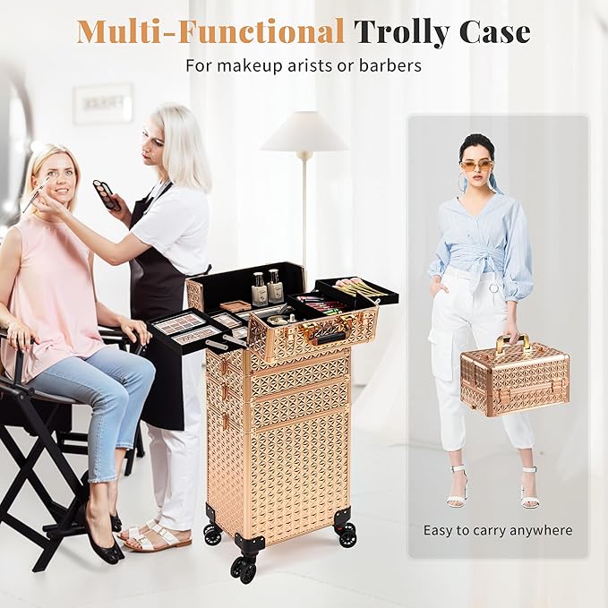 AROUS 5 in 1 Rolling Makeup Train Case Cosmetology Case on Wheels Large Cosmetic Organizer Travel Cart for Hairstylist Artist Nail Beauty Salon Barber,Gold