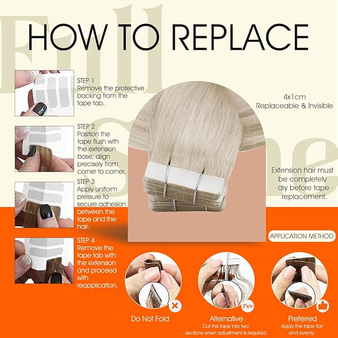 - Easy to Apply: Tape in hair extensions are designed for a streamlined application; When using the sandwich method, align both pieces, avoid excessive heat on the tape; Do not overload hair between sections; Pre-taped strips allow faster application