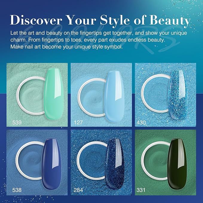 - Ocean Series Dip Powder Set: With this premium dip powder set covering 6 different tones(blue & green, pure & shimmery; 10g/box), your nails will look brilliant shiny finish, be lightweight, and more attractive. The set will meet your needs on all occasions(daily routine life, party, travel, etc) all year round