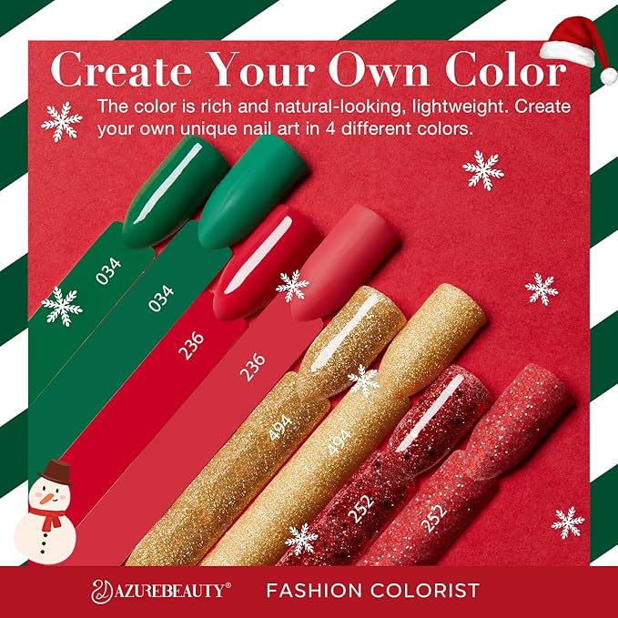 AZUREBEAUTY Christmas Dip Powder Nail Kit, 4 Colors Red Green Gold Glitter Dipping Powder System Liquid Set Recycling Tray, French Nail Art Base & Top Coat Activator DIY Salon.