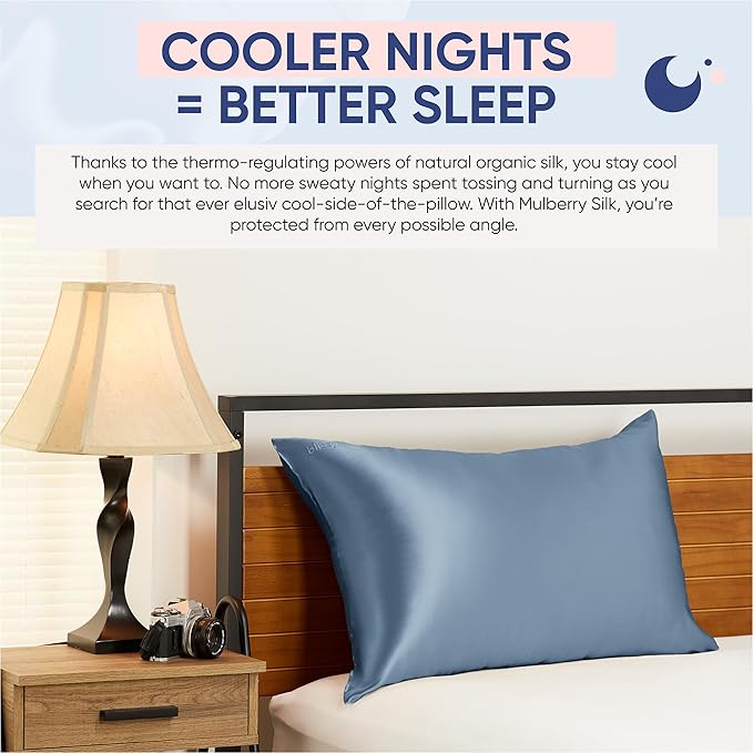 - BETTER & COOLER SLEEP: The temperature regulating properties of the Blissy silk pillowcase allow you to keep cool at all times during the night without the discomfort associated with fluctuating temperature and the constant tossing and turning for a restful night sleep.