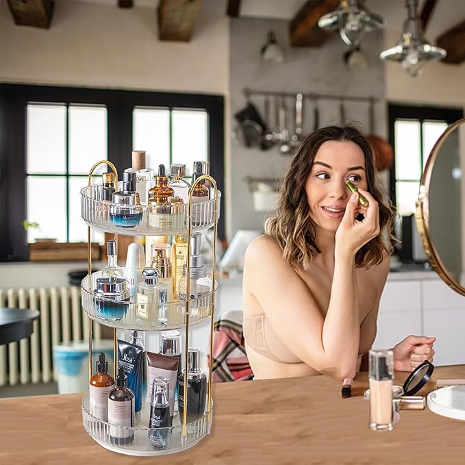 - 3-LAYER LARGE CAPACITY - The makeup organizer for vanity has three layers without partition and can be placed according to your own preference.It can be used to store perfume, nail polish, lipstick, powder blusher, eye shadow, base makeup, makeup powder and nail beauty tools, as well as facial cleanser and other toiletries to meet your daily needs while saving space for you, It can be disassembled freely and used as a layer