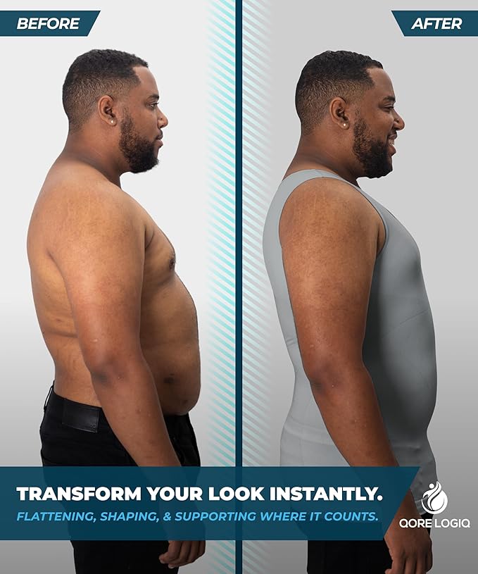 • DESIGNED FOR BIG&TALL: Take back your physique with QORE LOGIQ compression tank top. Our men's shapewear minimizes gynecomastia while slimming your chest, tummy, and sides. Designed with extra length, this mens body shaper slimming shirt offers a comfortable and effective fit for big and tall builds