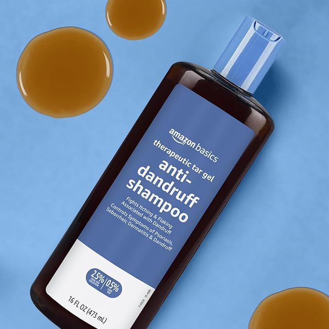 - One 16 fl oz bottle of Amazon Basics Therapeutic Plus Tar Gel Anti-Dandruff Shampoo 0.5% Coal Tar
