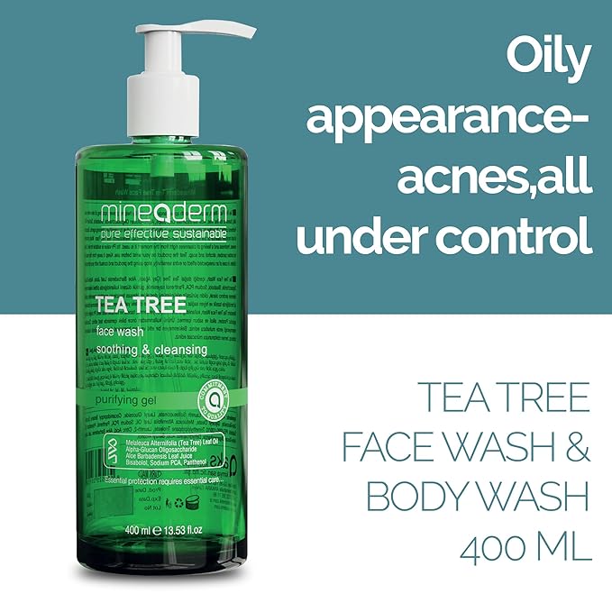 Mineaderm Tea Tree Face Wash for Acne-Prone & Oily Skin – Purifying Facial Cleanser with Aloe Vera, Panthenol & Bisabolol – Gentle Daily Gel Cleanser – 13.53 fl oz