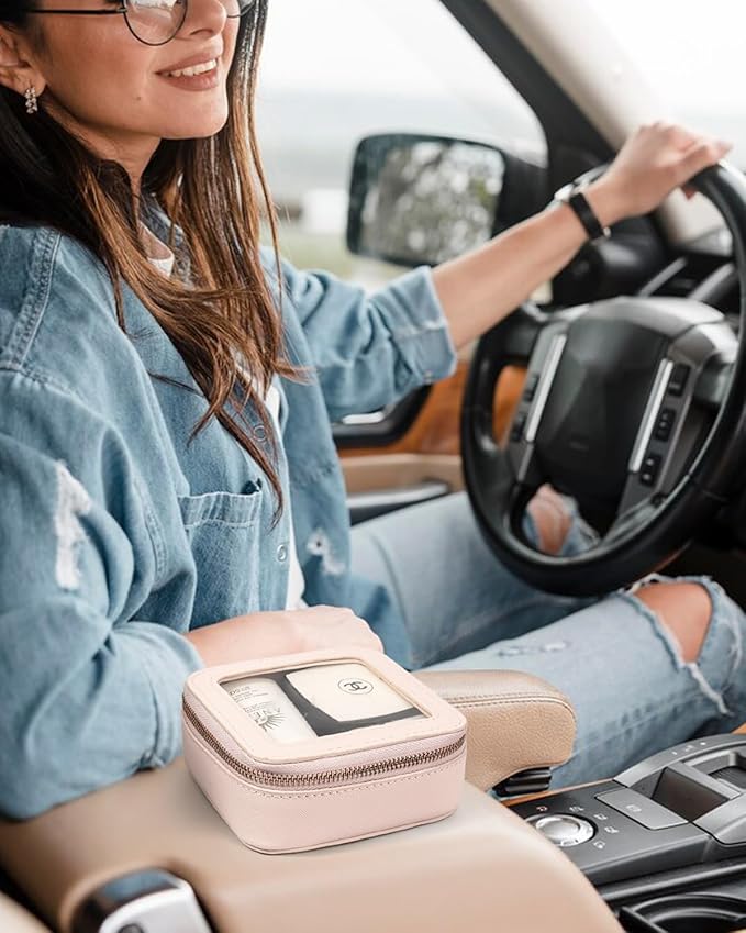 - CAR MUST HAVE ESSENTIALS CLEAR MAKEUP BAG : Large Size Measuring 9.84'' x 7.67'' x 3.14''(25cm x19.5cm x 8cm), Mini Size 5'' x 4.7'' x 2''(12.7cm x 12cm x 5cm), our clear makeup bag is elegant ,and stylish, this makeup travel organizer was designed in a minimalist boxy shape and Crafted in beautiful PU leather and finished with polished hardware, the trendy makeup bag is easy to carrying in your handbag or carry-on.