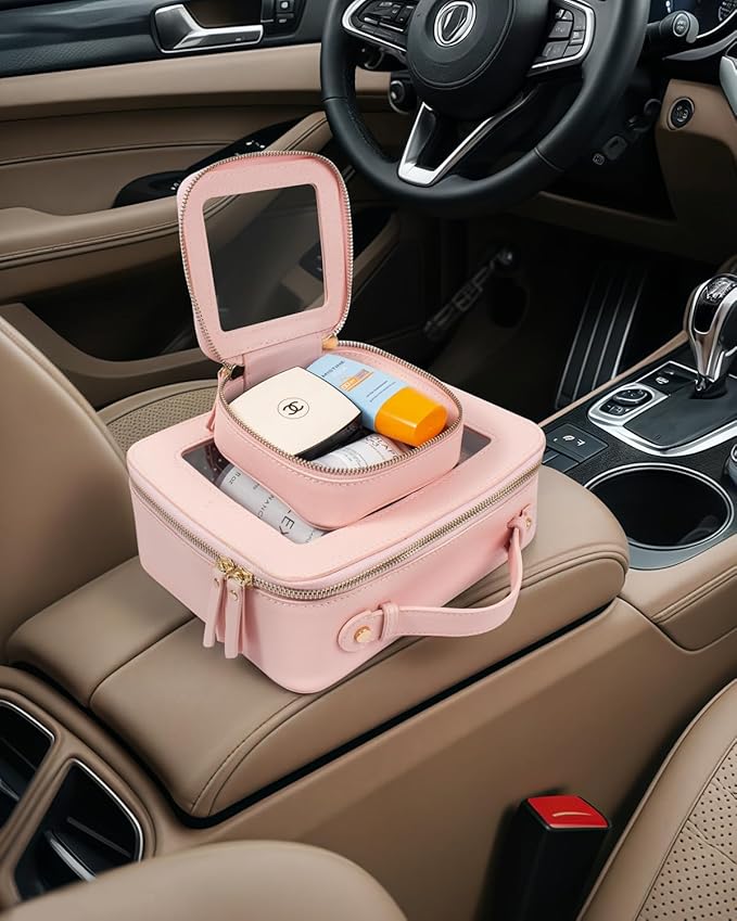 - ✈️CAR MUST HAVE ESSENTIALS CLEAR MAKEUP BAG : Large Size Measuring 9.84'' x 7.67'' x 3.14''(25cm x19.5cm x 8cm), Mini Size 5'' x 4.7'' x 2''(12.7cm x 12cm x 5cm), our clear makeup bag is elegant ,and stylish, this makeup travel organizer was designed in a minimalist boxy shape and Crafted in beautiful PU leather and finished with polished hardware, the trendy makeup bag is easy to carrying in your handbag or carry-on.