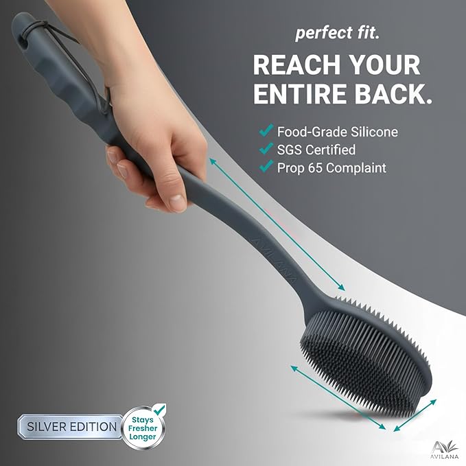 - ★ WHERE SCIENCE MEETS YOUR SHOWER — THE SCIENCE BEHIND SILVER — Silver ions are nature's freshness agent. Infused directly into the silicone head (not a coating), they resist odor-causing buildup. Trusted technology used in hospitals for 40+ years. Your back scrubber stays fresher between uses.