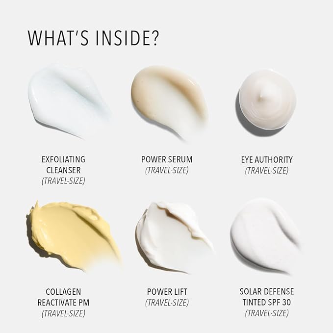 - Kit Includes Mini Travel-sized: Power Serum (0.34fl oz), Power Lift (0.17 fl oz), Eye Authority (0.17 fl oz), Collagen Reactivate PM (0.17 fl oz), Exfoliating Cleanser (1.69 fl oz), Solar Defense Tinted SPF 30 (0.5 fl oz), Navy Puffer Bag