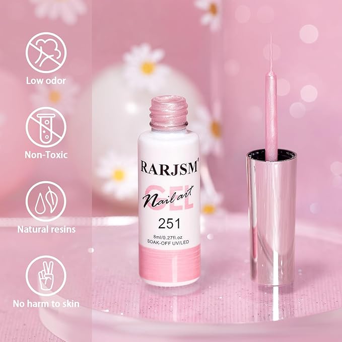 - PEARL PINK GEL LINER:Pearl pink is the base color of nail manicure decoration, especially for nail art manicures. It not only creates a gorgeous momentum for your nails. The minimalist approach to the manicure design is the pink glitter line, so this pearl shell glitter nail art gel liner is your essential one