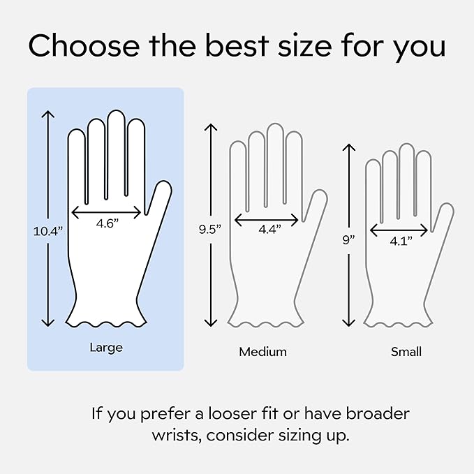- Night Gloves That Stay On: Our white cotton gloves for sleeping have elasticated wrists for a snug, never restrictive, fit, meaning they don't slip off in the night. Size L fits palms up to 4.6" and 10.4" in length