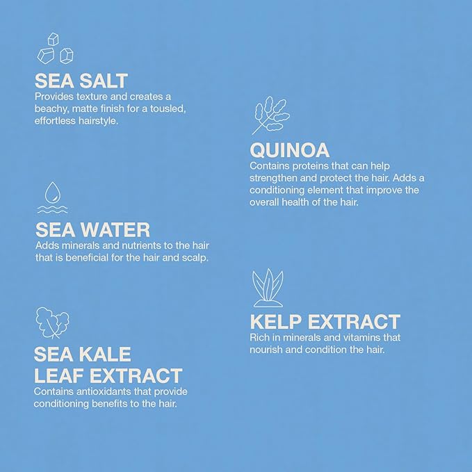 - Infused with Sea Kale Leaf & Kelp Extract - Sea Salt Texture Spray is infused with sea kale leaf and kelp extract to improve the health and hydration of your hair by delivering vitamins, minerals, and antioxidants to your hair and scalp for a moisturizing, nourishing, and conditioning effect.