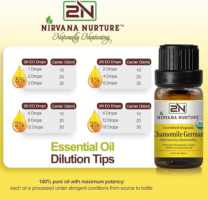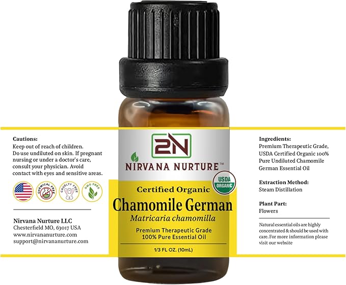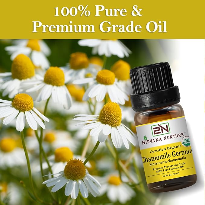 - CALM & RELAX: Nirvana Nurture Chamomile German Essential Oil uplift mood, help calmness and encourage relaxation. It helps refresh the mind, unwind the body, and support restful sleep. Dilute 3–4 drops in a carrier oil for a soothing massage, or add 8–10 drops to warm bath water to enhance your bedtime routine.
