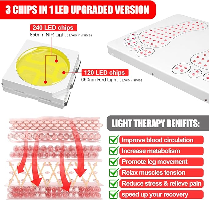 - 👣【Targeted Pain Relief for Feet & Toes】 → Combines 660nm red light and 850nm infrared light to penetrate up to 10mm deep, stimulating cellular energy (ATP) to reduce inflammation, ease nerve pain, and accelerate healing for plantar fasciitis, arthritis, and heel spurs69.