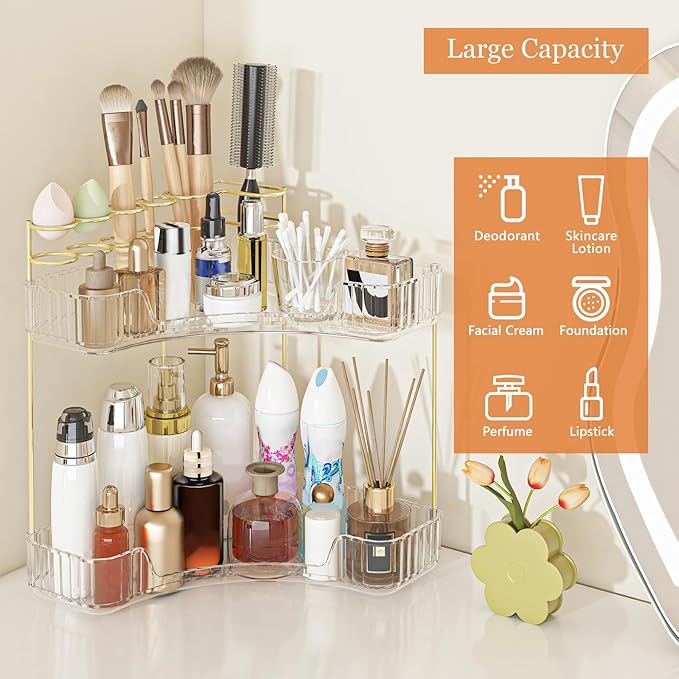 - 【Corner makeup organizer】 Effortlessly store and access your cosmetics by Webetop 2 tier corner bathroom organizer with convenient makeup brush holder